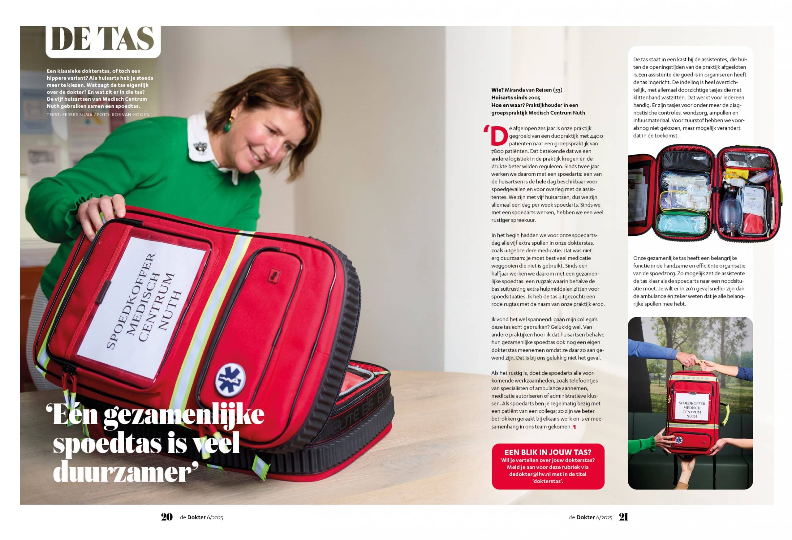 Een klassieke dokterstas, of toch een hippere variant? Als huisarts heb je steeds meer te kiezen. Wat zegt de tas eigenlijk over de dokter? En wat zit er in die tas? De vijf huisartsen van Medisch Centrum Nuth gebruiken samen een spoedtas.