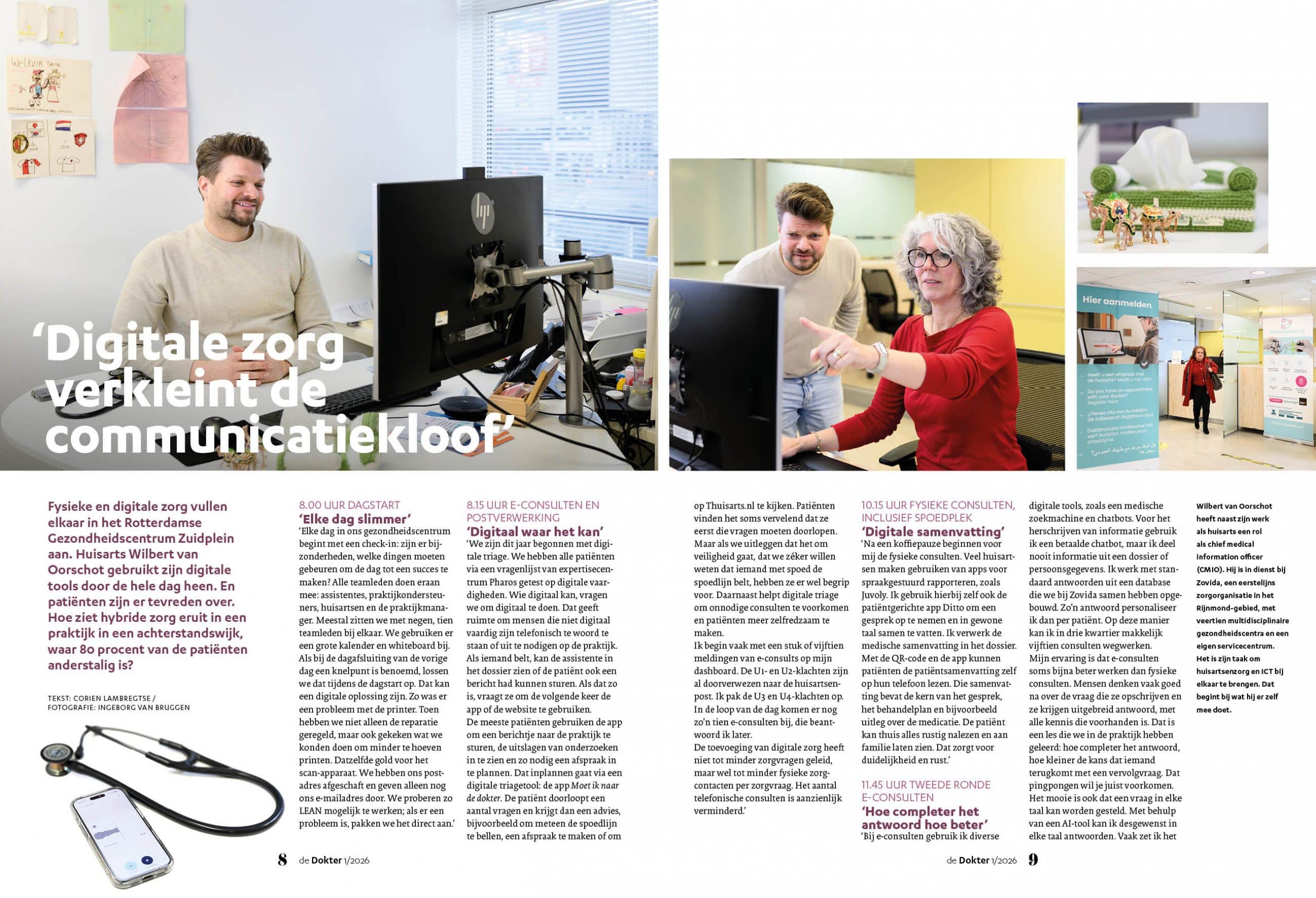 Fysieke en digitale zorg vullen elkaar in het Rotterdamse Gezondheidscentrum Zuidplein aan. Huisarts Wilbert van Oorschot gebruikt zijn digitale tools door de hele dag heen. En patiënten zijn er tevreden over. Hoe ziet hybride zorg eruit in een praktijk in een achterstandswijk, waar 80 procent van de patiënten anderstalig is?