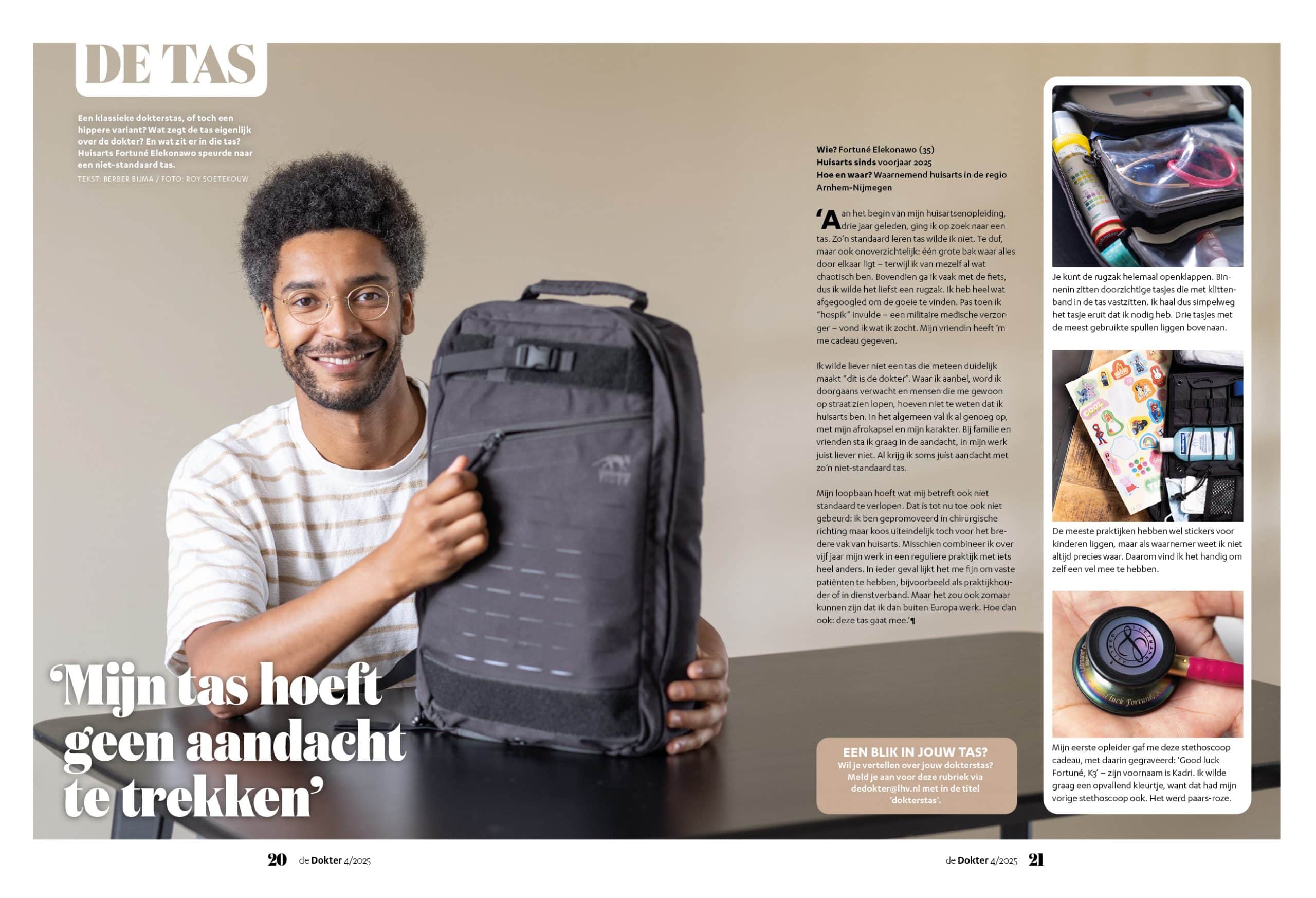 Een klassieke dokterstas, of toch een hippere variant? Wat zegt de tas eigenlijk over de dokter? En wat zit er in die tas? Huisarts Fortuné Elekonawo speurde naar een niet-standaard tas.