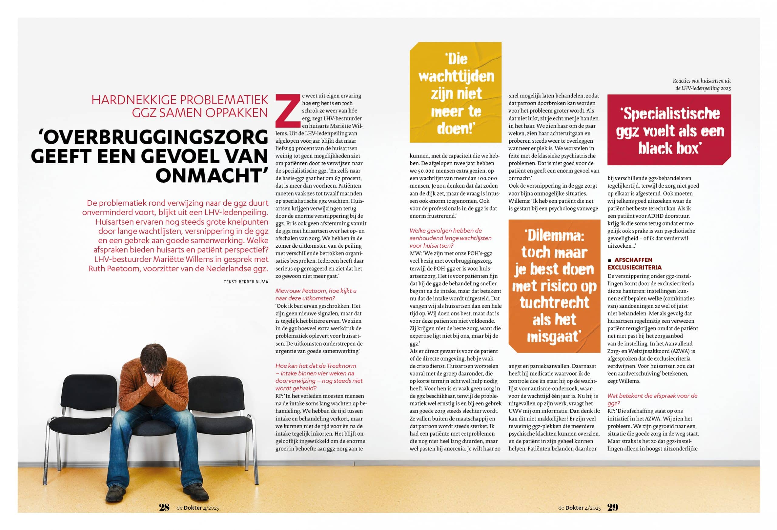 De problematiek rond verwijzing naar de ggz duurt onverminderd voort, blijkt uit een LHV-ledenpeiling. Huisartsen ervaren nog steeds grote knelpunten door lange wachtlijsten, versnippering in de ggz en een gebrek aan goede samenwerking. Welke afspraken bieden huisarts en patiënt perspectief? LHV-bestuurder Mariëtte Willems in gesprek met Ruth Peetoom, voorzitter van de Nederlandse ggz.