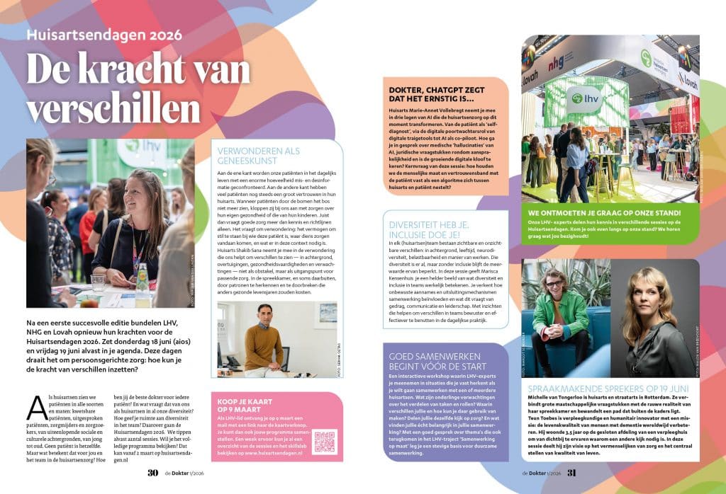 Na een eerste succesvolle editie bundelen LHV, NHG en Lovah opnieuw hun krachten voor de Huisartsendagen 2026. Zet donderdag 18 juni (aios) en vrijdag 19 juni alvast in je agenda. Deze dagen draait het om persoonsgerichte zorg: hoe kun je de kracht van verschillen inzetten?